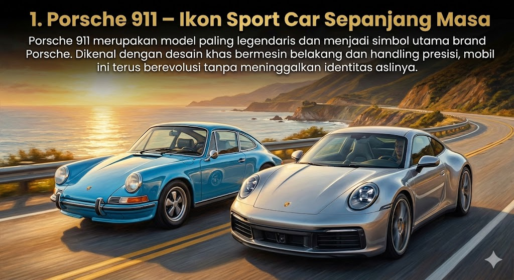 Porsche 911 merupakan model paling legendaris dan menjadi simbol utama brand Porsche. Dikenal dengan desain khas bermesin belakang dan handling presisi, mobil ini terus berevolusi tanpa meninggalkan identitas aslinya.
