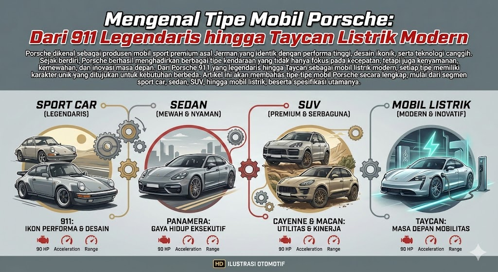 Artikel ini akan membahas tipe-tipe mobil Porsche secara lengkap, mulai dari segmen sport car, sedan, SUV, hingga mobil listrik, beserta spesifikasi utamanya.